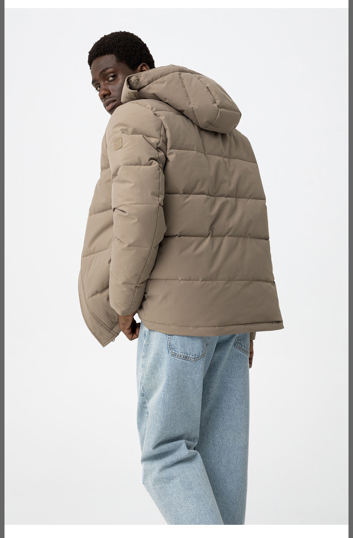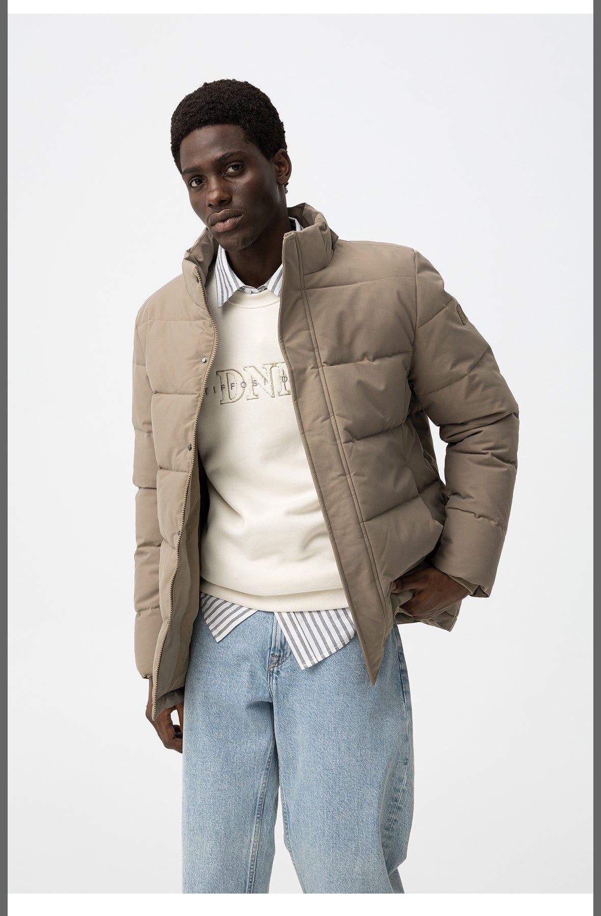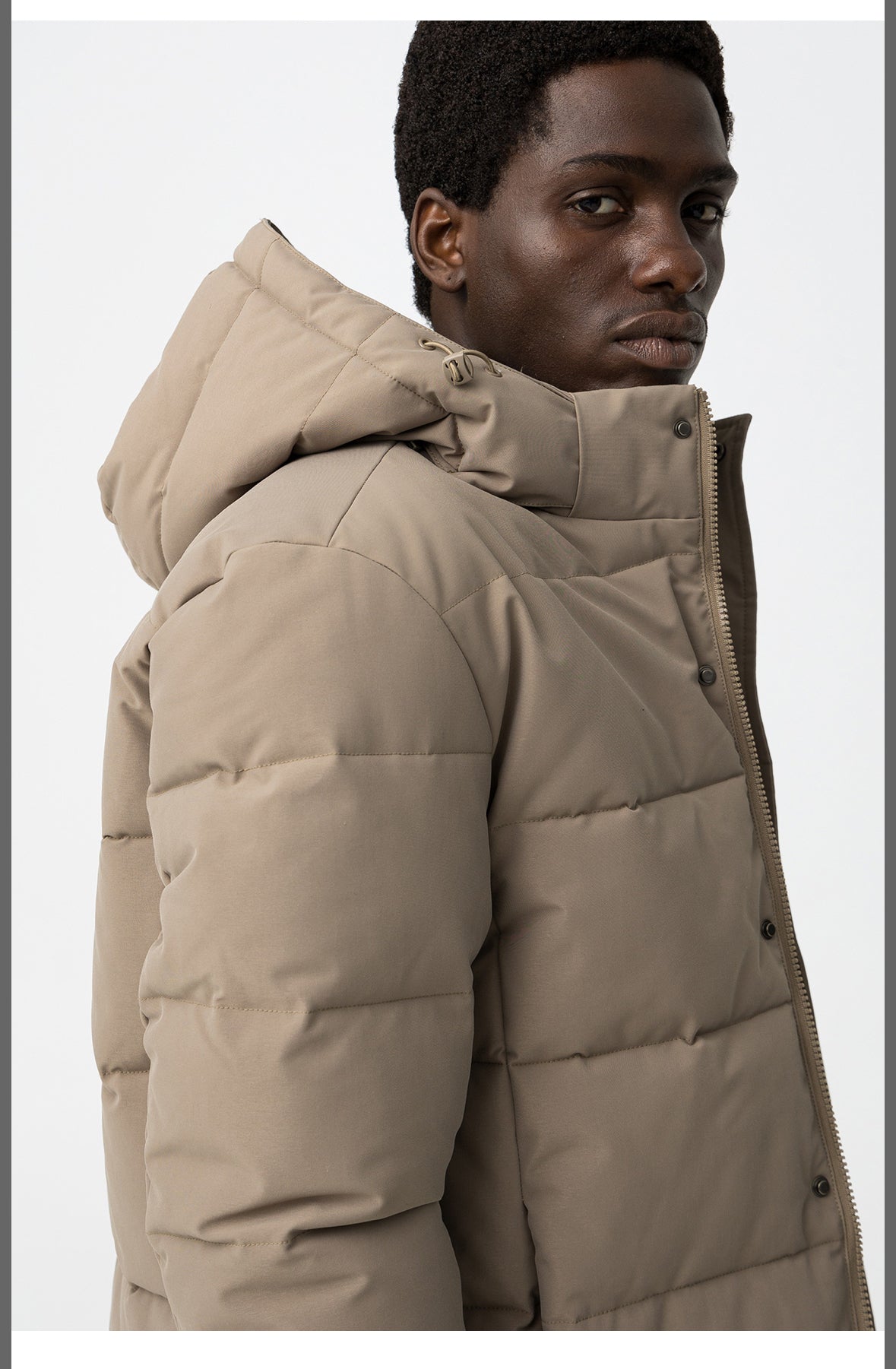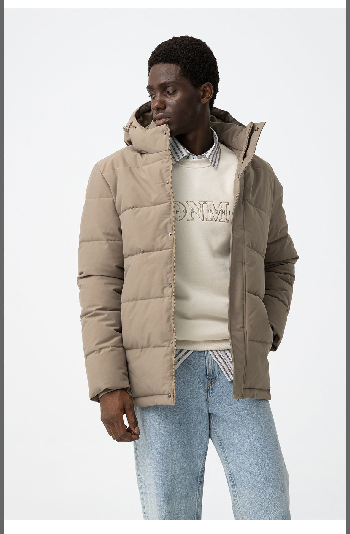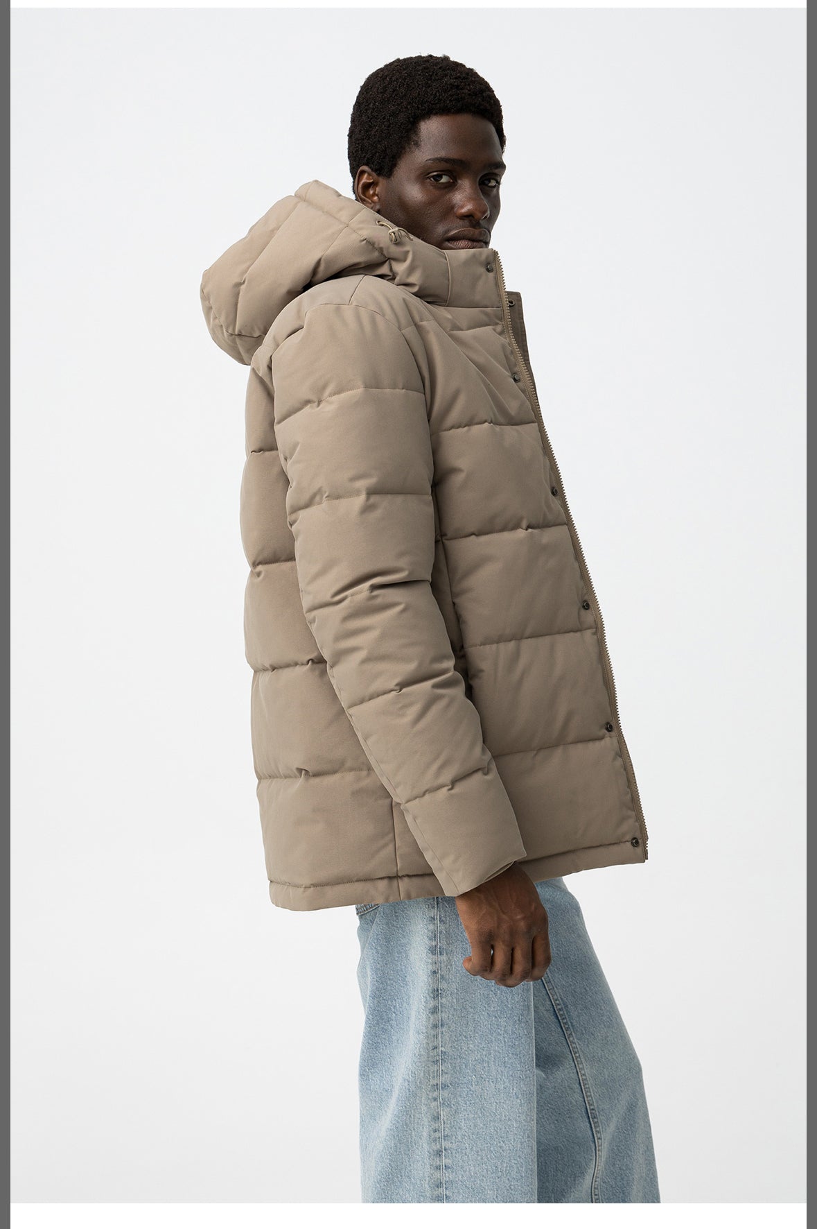 Piumino beige dalla vestibilità regolare con cappuccio e chiusura frontale con bottoni, perfetta per la stratificazione invernale.