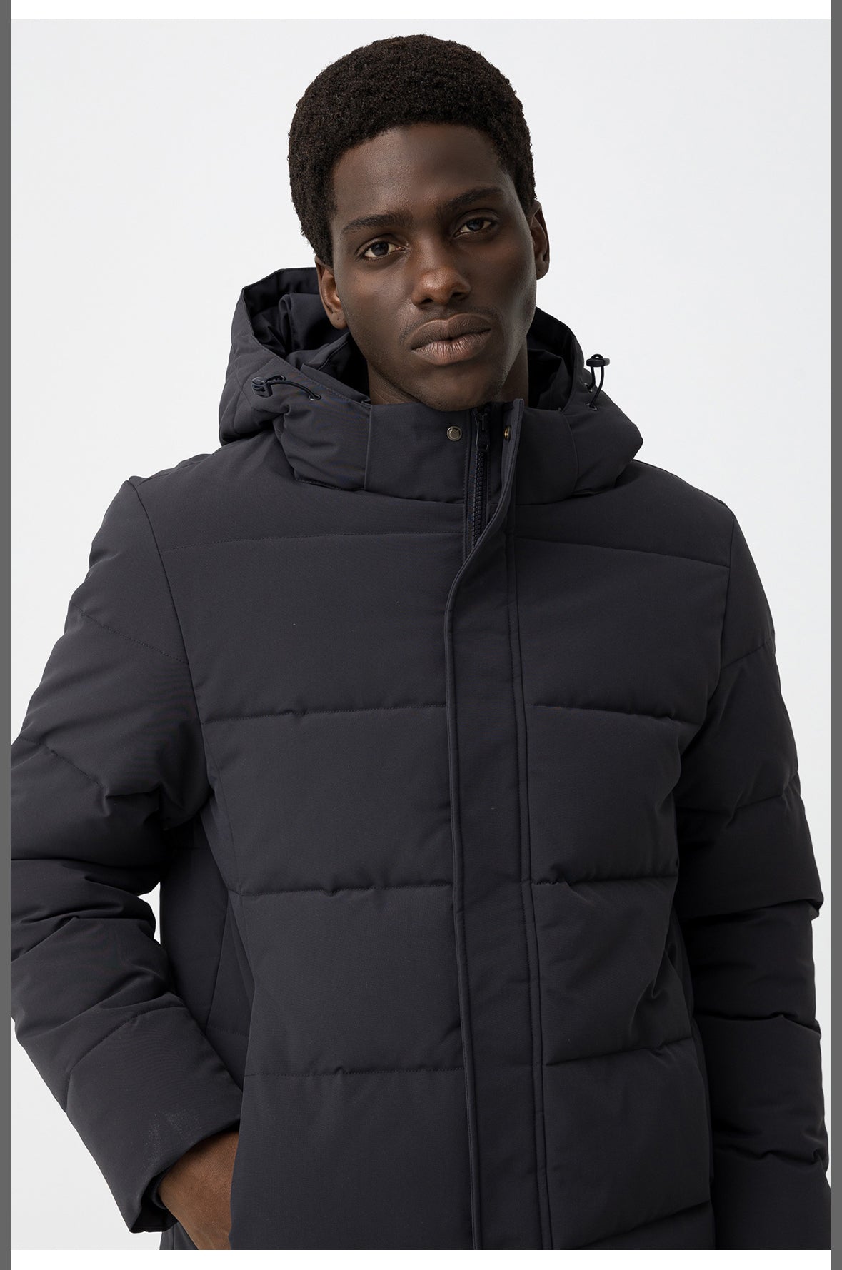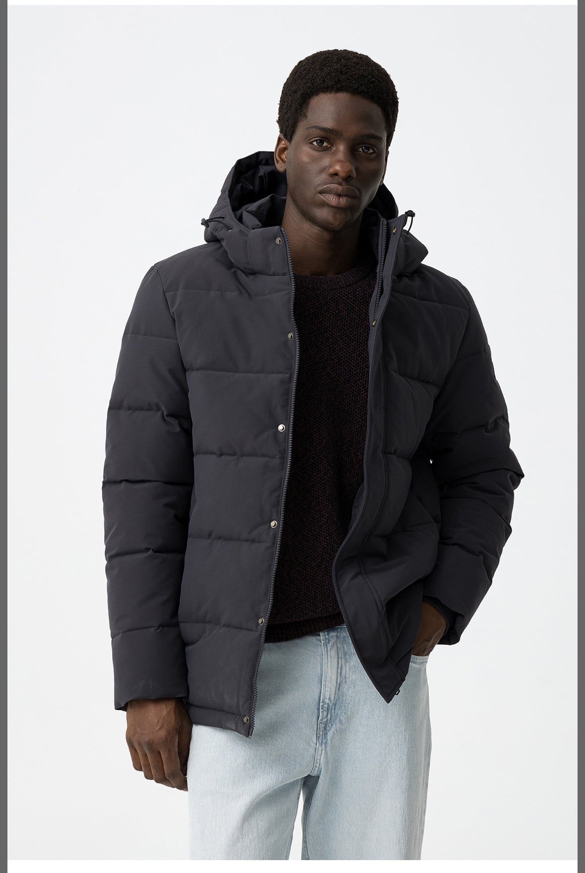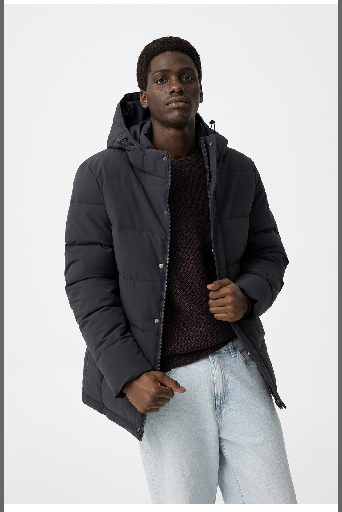 Piumino blu dalla vestibilità regolare con cappuccio e chiusura frontale con bottoni, perfetta per la stratificazione invernale.