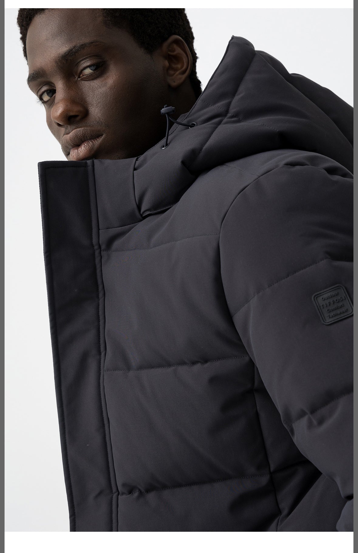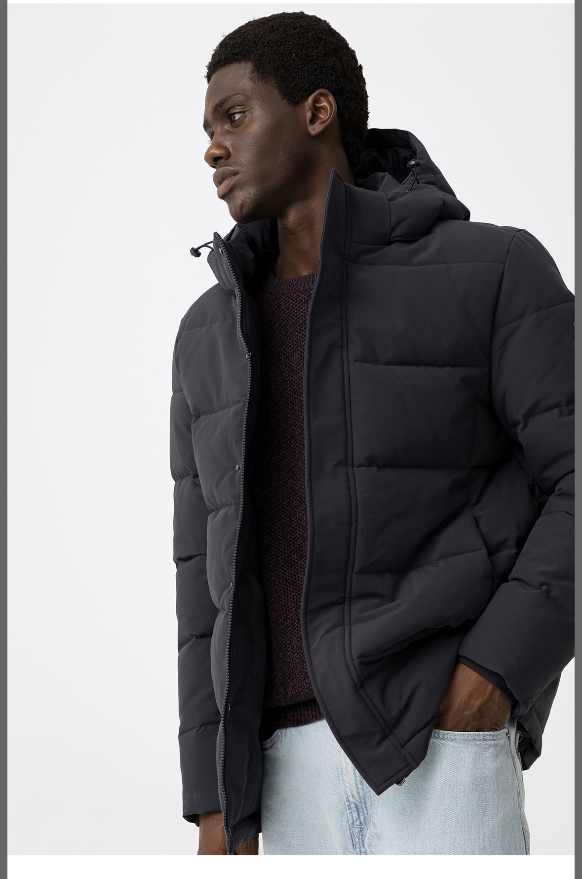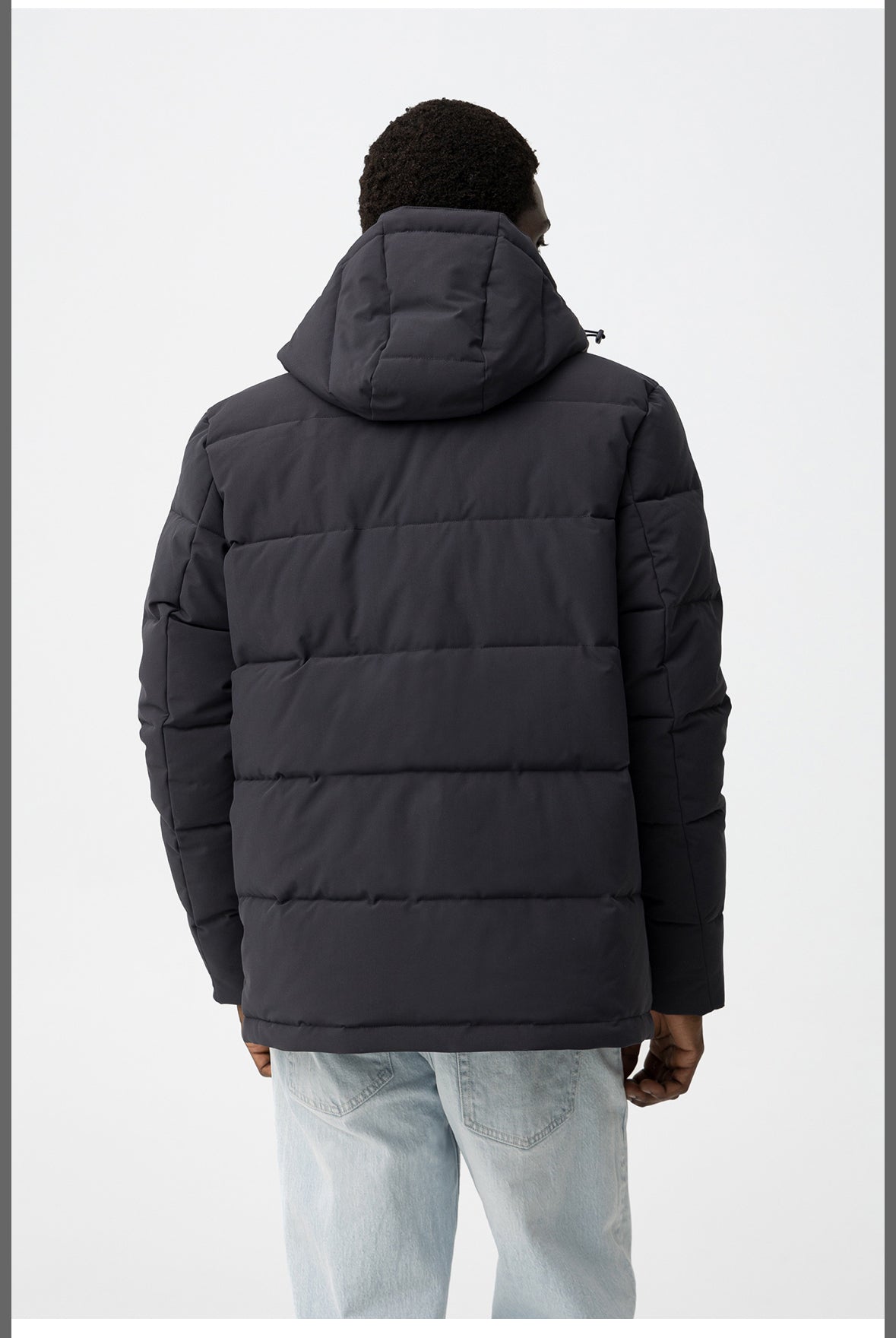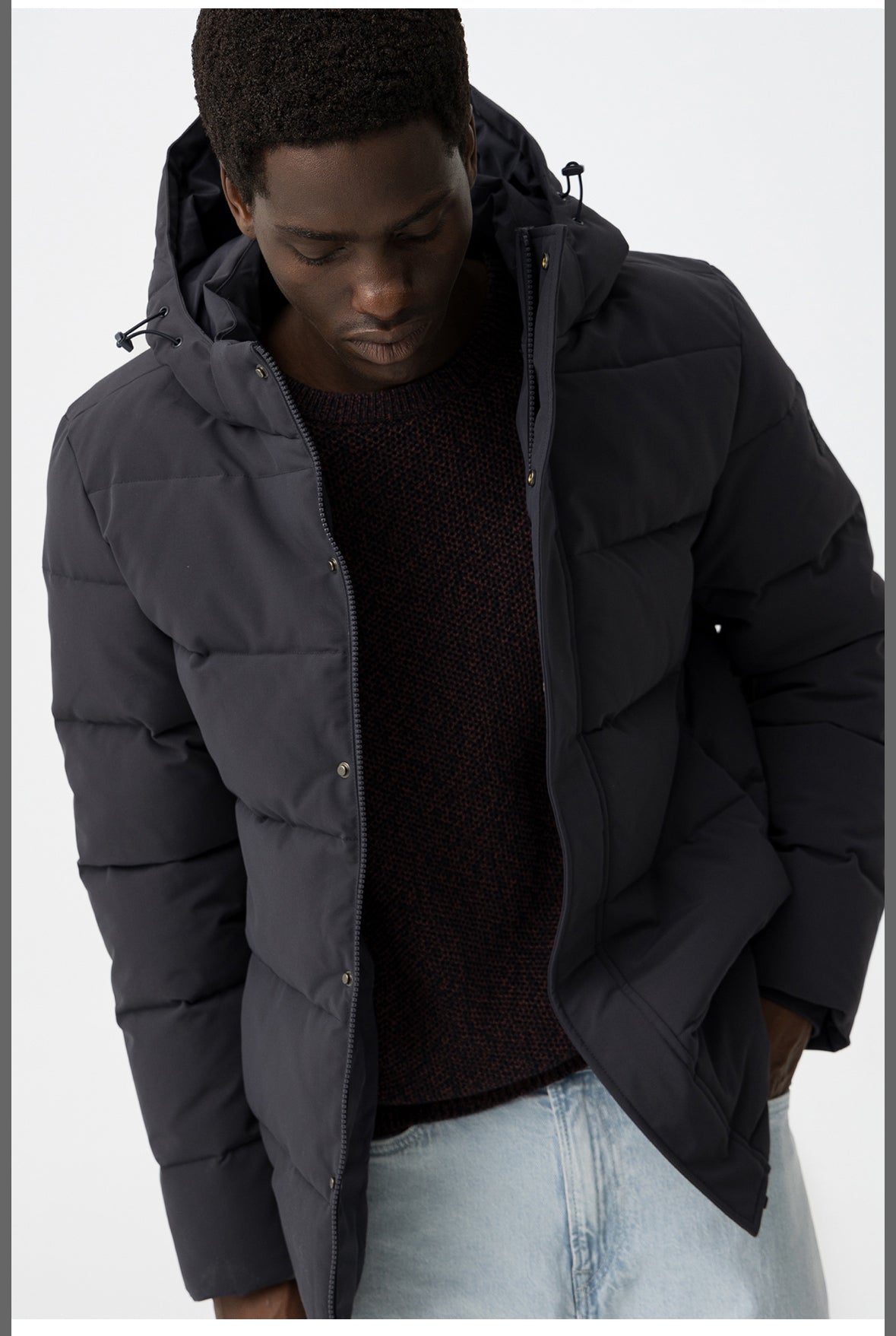 Piumino blu dalla vestibilità regolare con cappuccio e chiusura frontale con bottoni, perfetta per la stratificazione invernale.