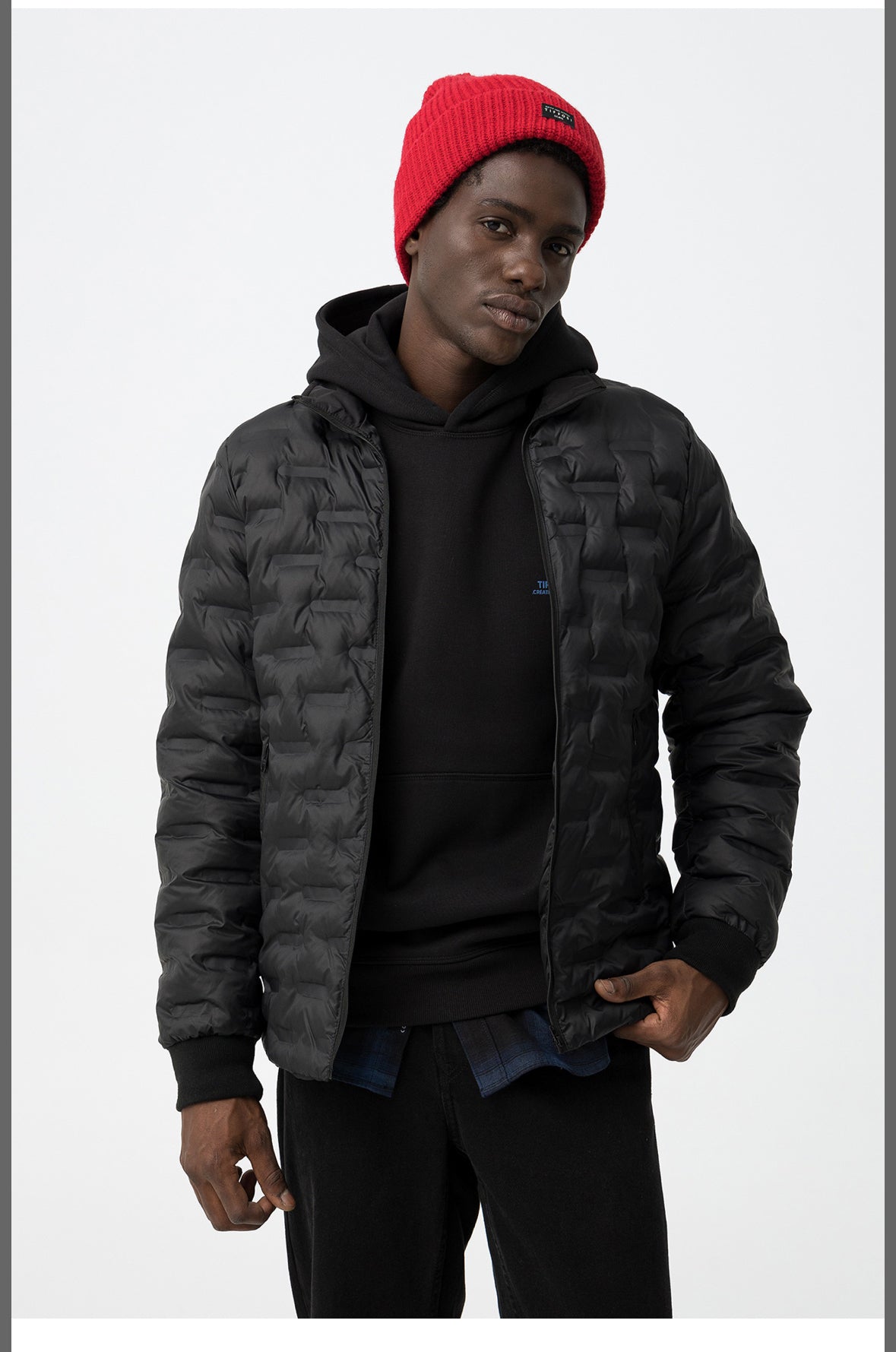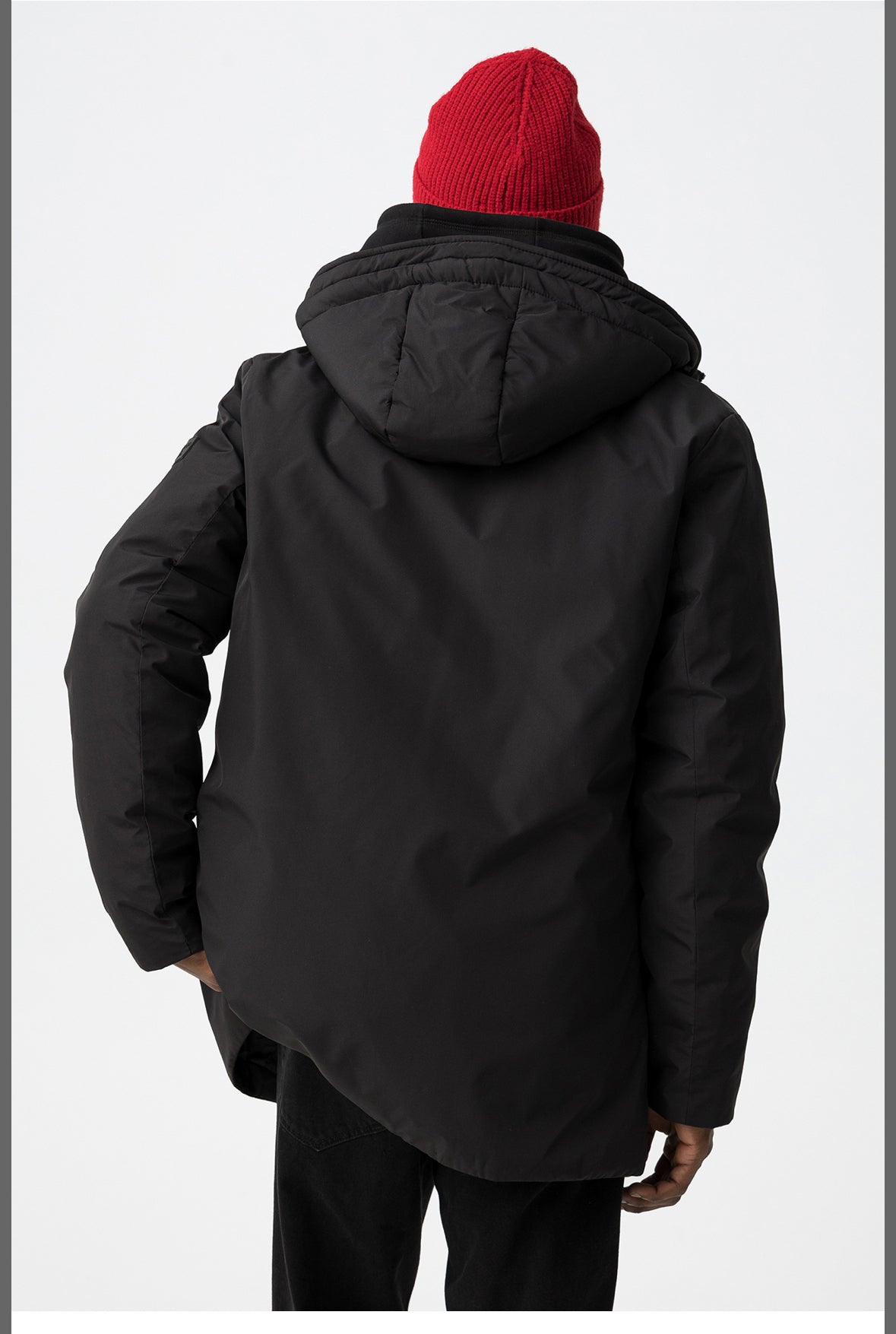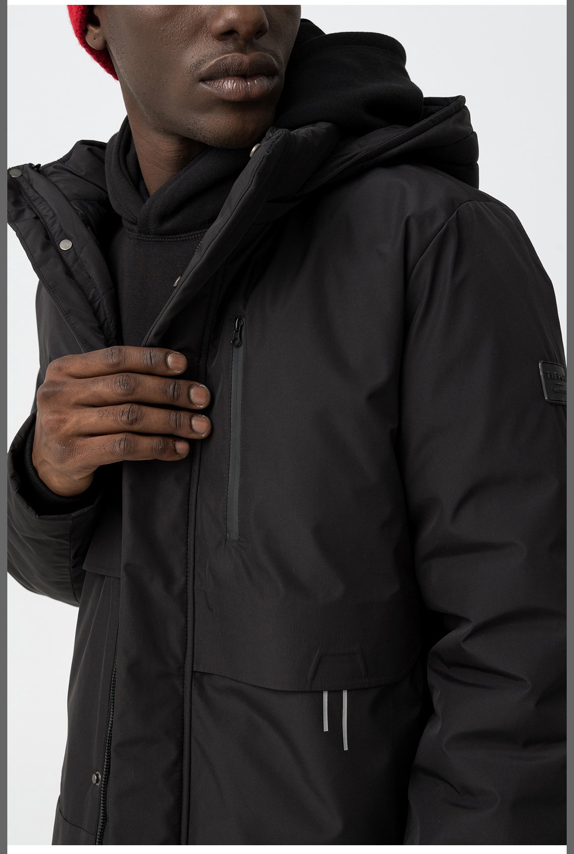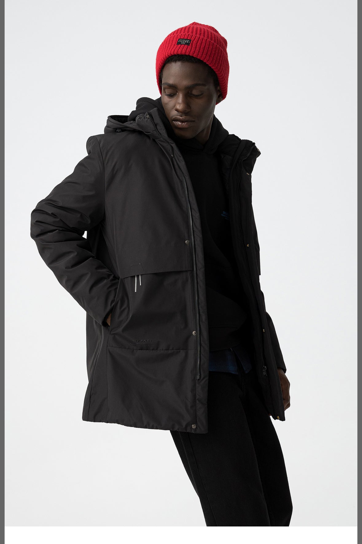 Cappotto nero dalla vestibilità regolare con cappuccio, tasche frontali e chiusura con zip per un look elegante.