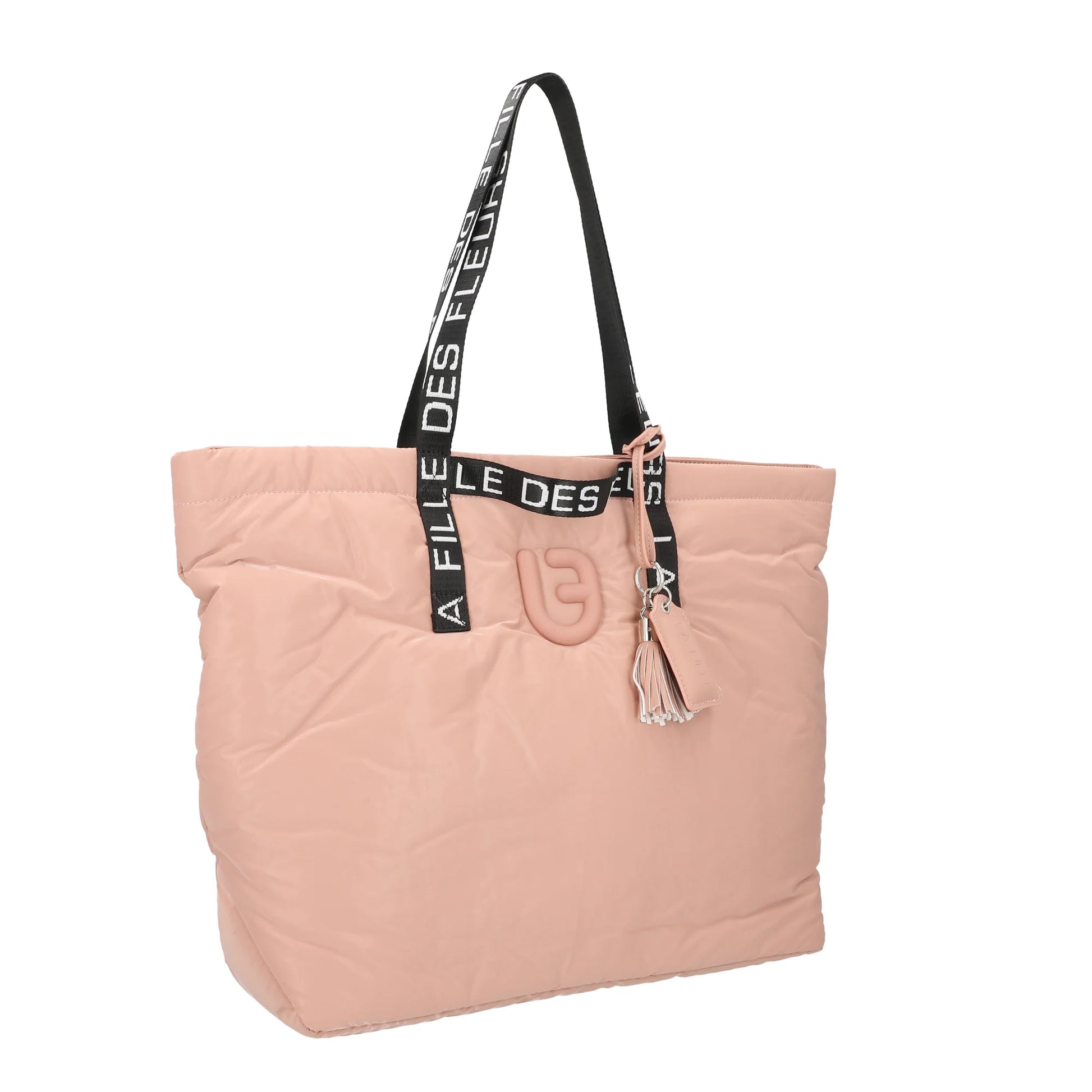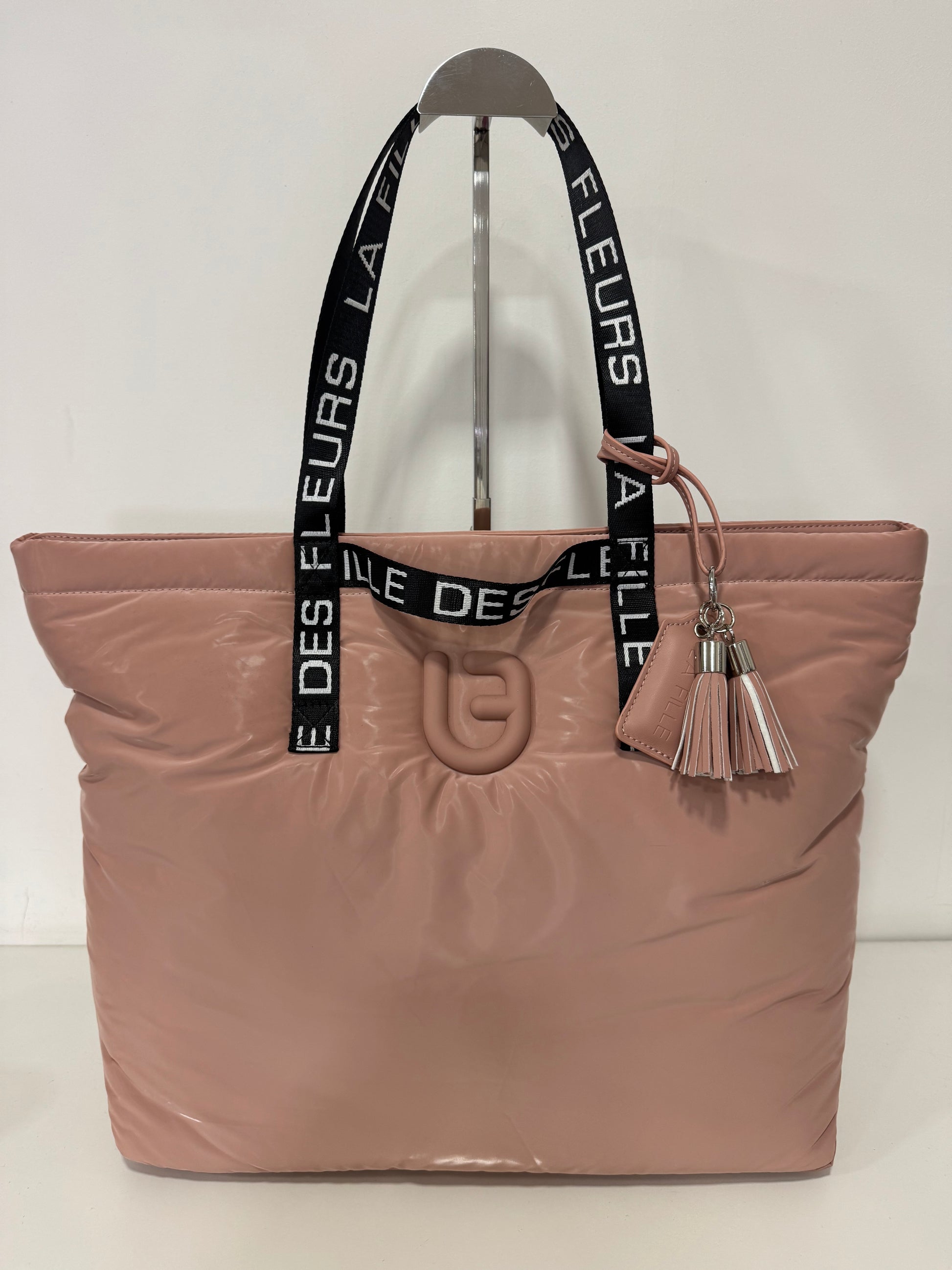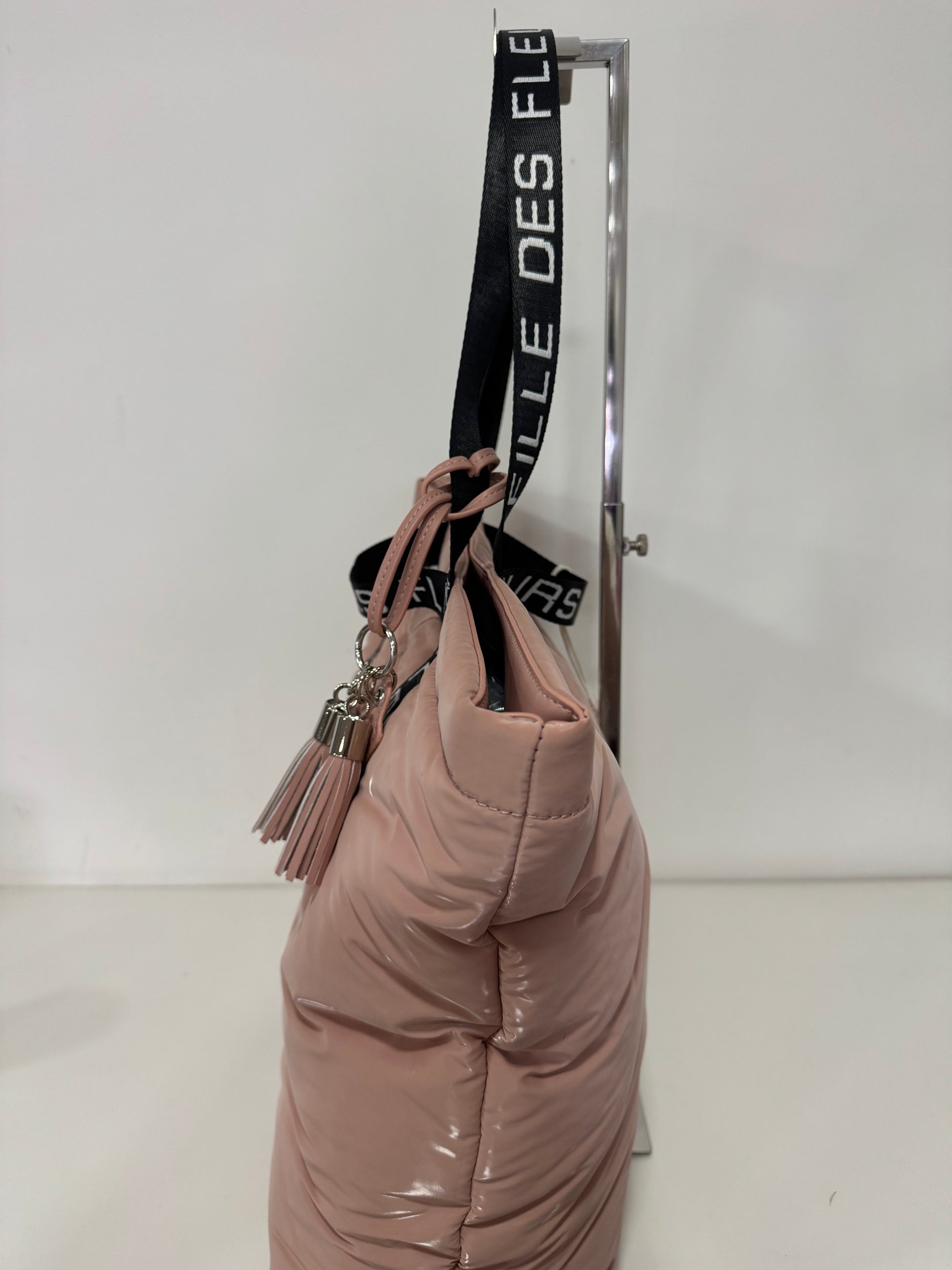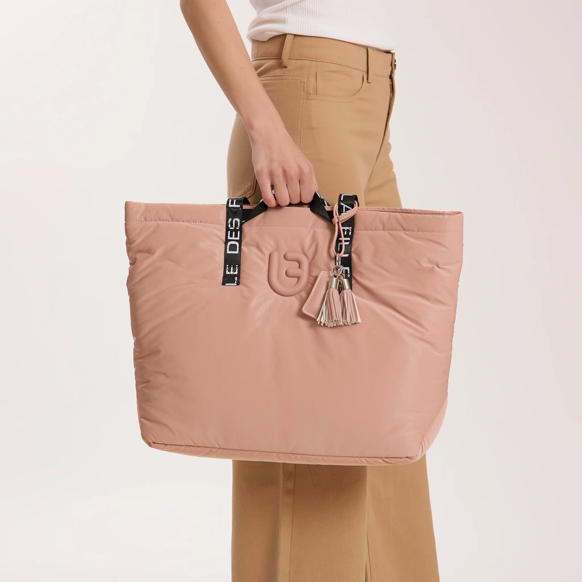 I manici logati in nastro tecnico definiscono il carattere sport-chic del modello, mentre il maxi logo in rilievo tono su tono e il charm con nappina e tag identificativo aggiungono dettagli iconici e distintivi.